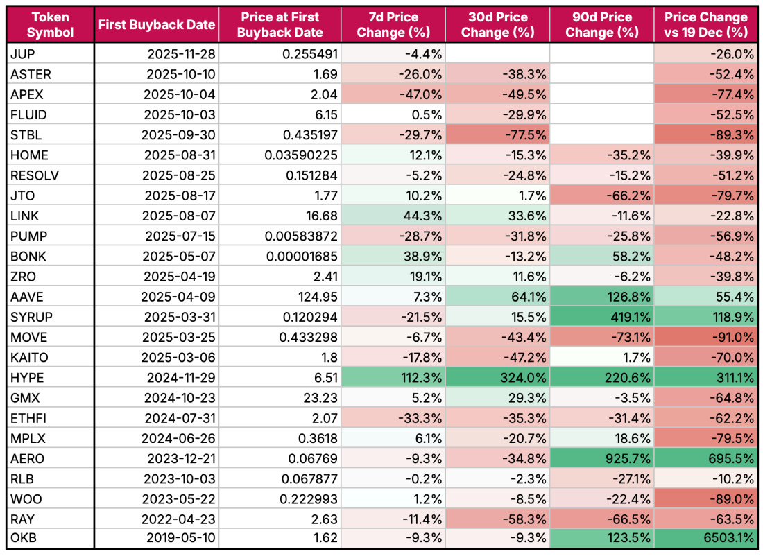 Here is the performance report from Tokenomist 2025 Annual report of major token buybacks. And except for a selected few tokens, the numbers don’t look good for a majority of them.